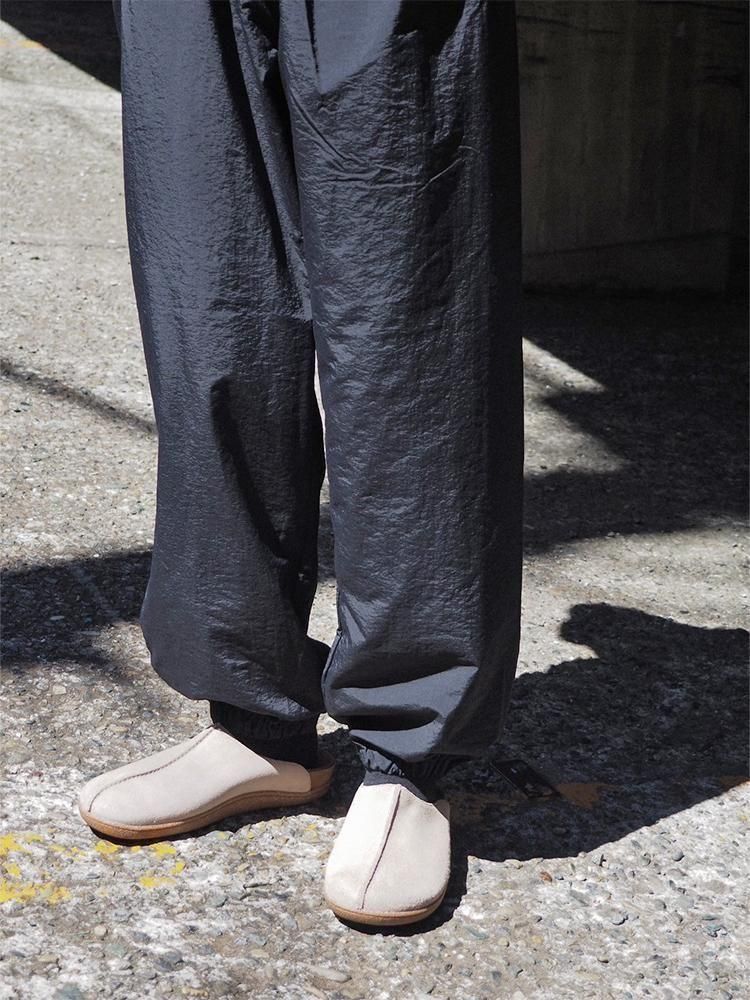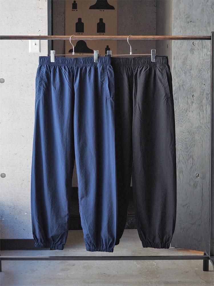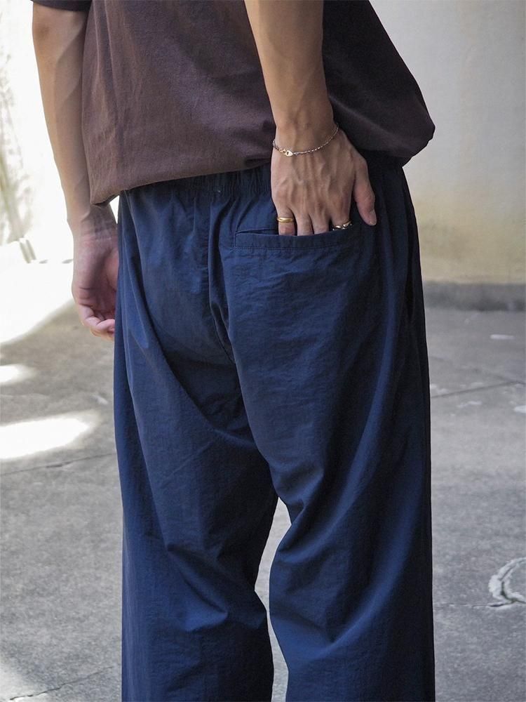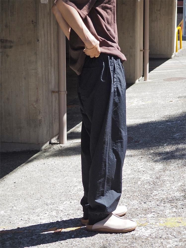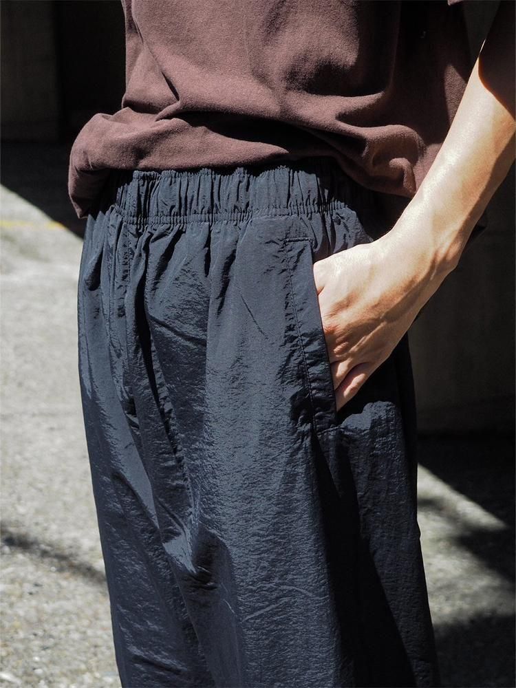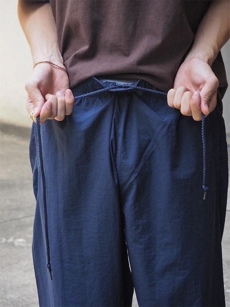 タフで軽やかなナイロン素材ですが、シワ加工でやわらかくコットンのような質感で快適な穿き心地のナイロンパンツ。