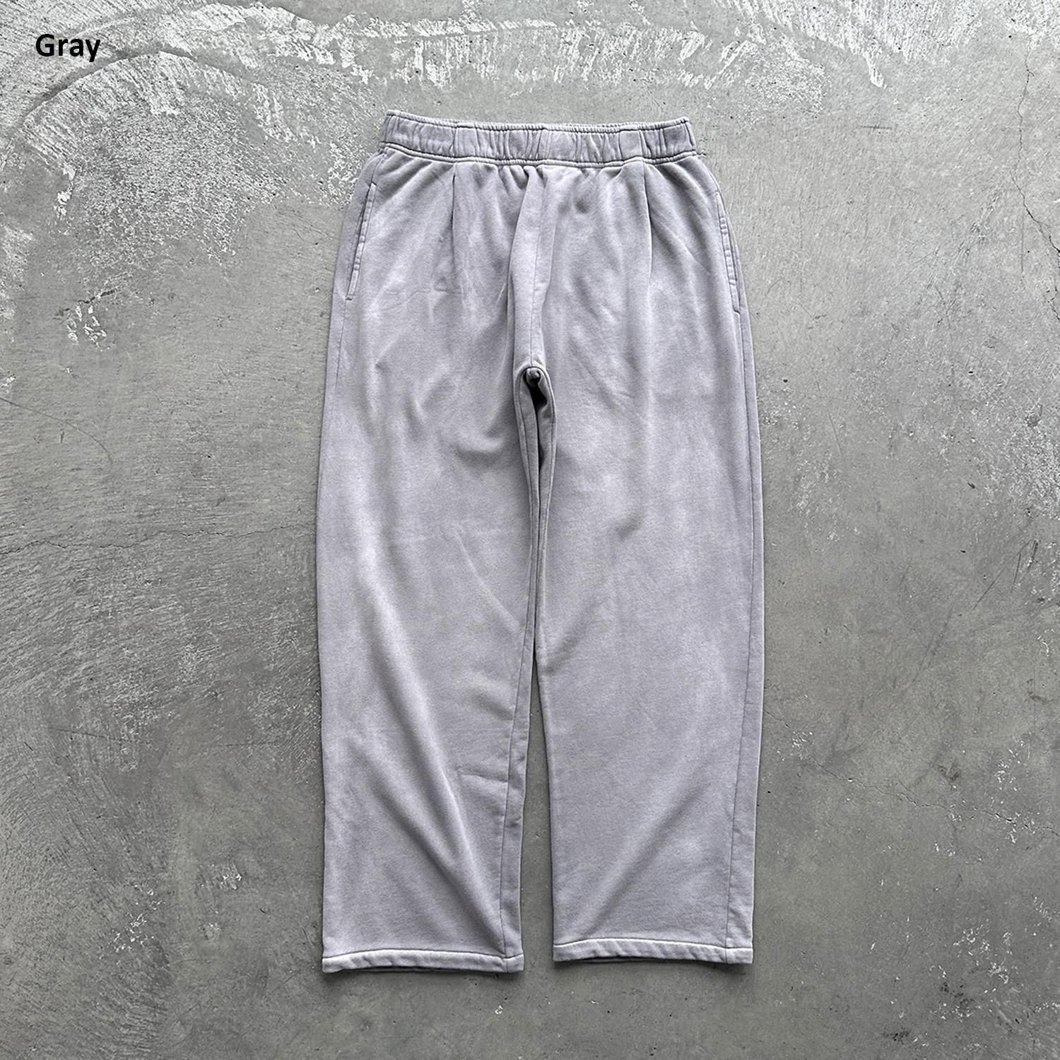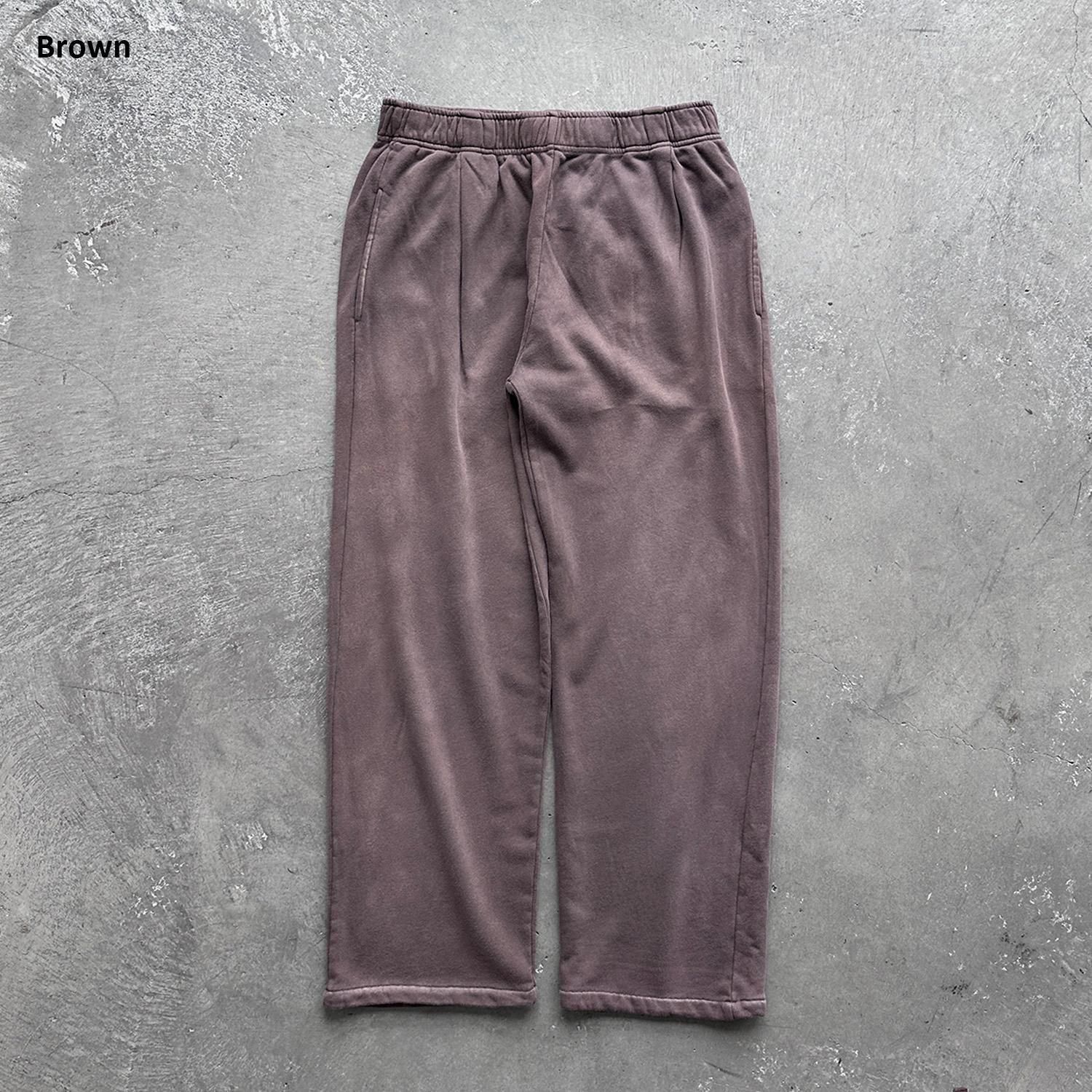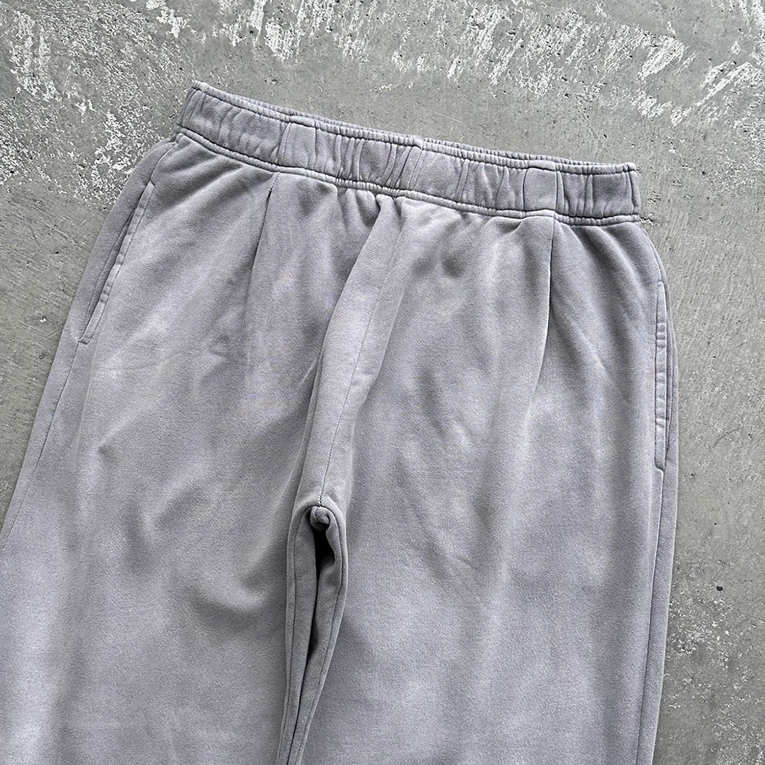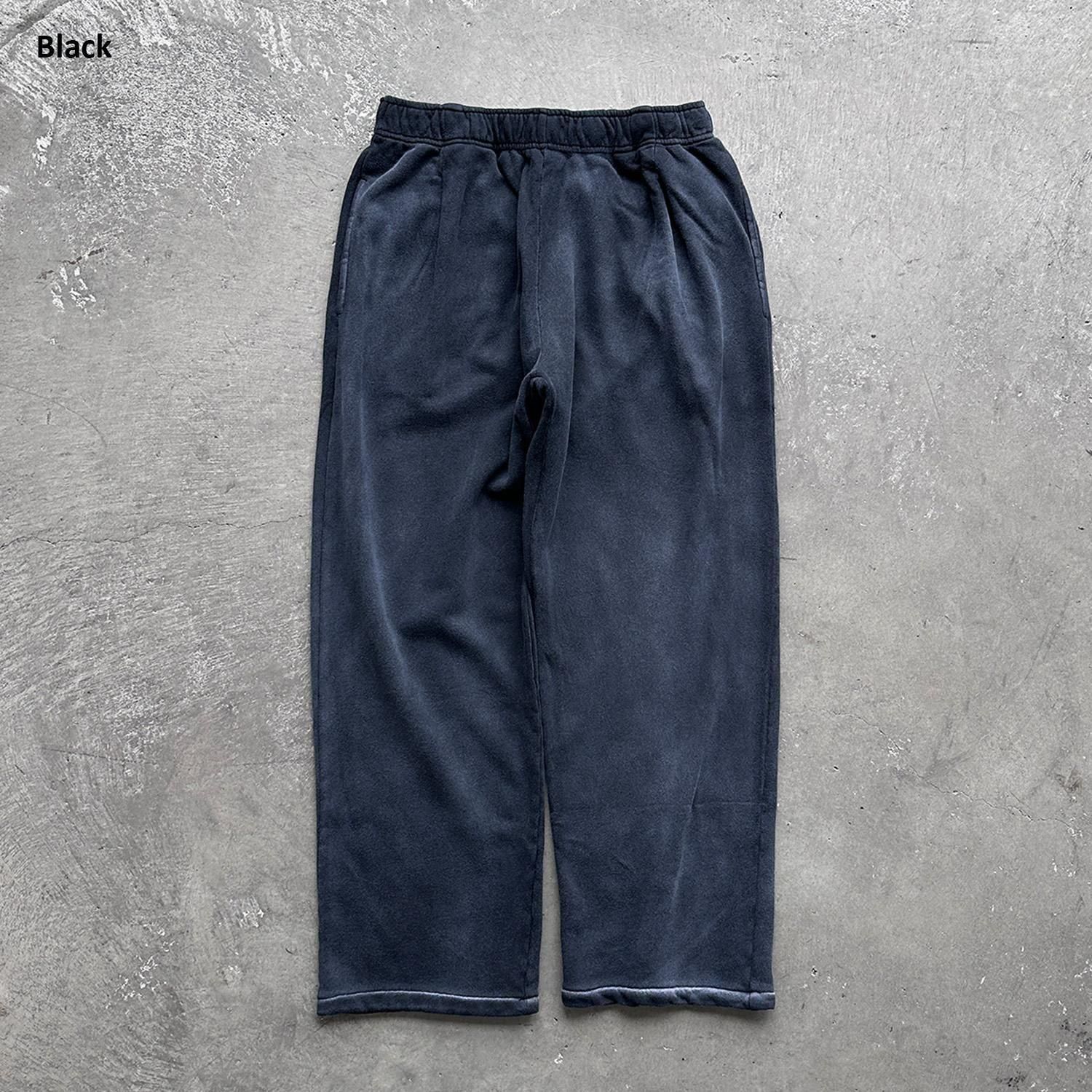 ヴィンテージのような退⾊感(⽇焼けしたような)を再現した加工と、タック入りのワイドシルエットが特徴的なスウェットパンツです。